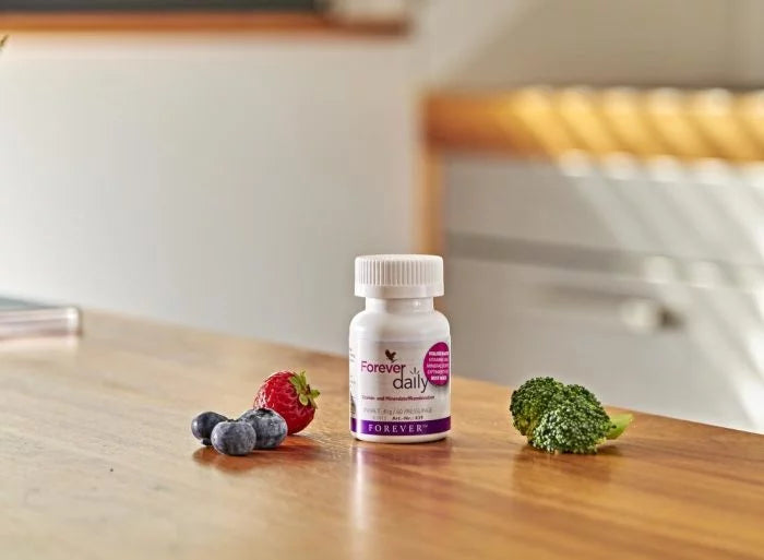 Forever daily™ ist eine optimal abgestimmte Vitamin- und Mineralstoffkombination mit ausgewogenen Extrakten aus Früchten und Gemüse. Für Männer und Frauen jeden Alters geeignet, insbesondere für Best Ager! Einmal täglich eingenommen sorgt der Pressling für einen ausgewogenen Start in den Tag. Nahrungsergänzung mit wichtigen Vitaminen und Mineralien von Forever.